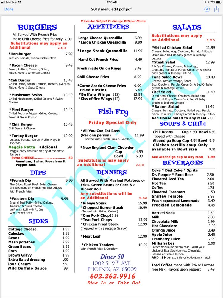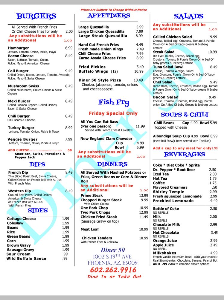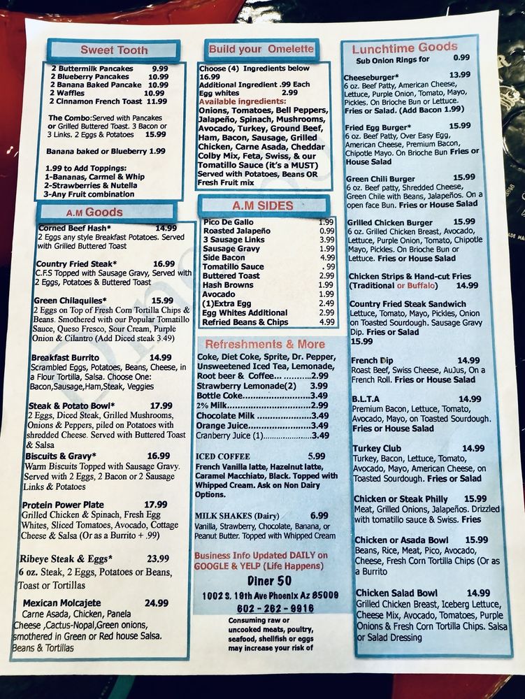 Located in Phoenix, AZ, Diner 50 is a Latinx-owned and women-owned diner offering a mix of Breakfast & Brunch options in a casual setting. With a wide range of utilities such as takeout, catering, outdoor seating, and happy hour specials, Diner 50 caters to a diverse range of customers. The menu includes limited vegetarian options and alcoholic beverages, making it a great spot for groups, families, and individuals alike. The restaurant also offers private dining options, waiter service, and free Wi-Fi, ensuring a comfortable dining experience. Whether you're looking for a hearty breakfast, a delicious brunch, or a satisfying lunch, Diner 50 has something for everyone. Don't forget to try their signature dishes and enjoy the welcoming atmosphere of this local favorite.